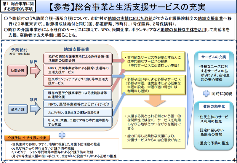 既存の介護事業所による既存のサービスに加えて、NPO、民間企業、ボランティアなど地域の多様な主体を活用して高齢者を支援するというものですが、