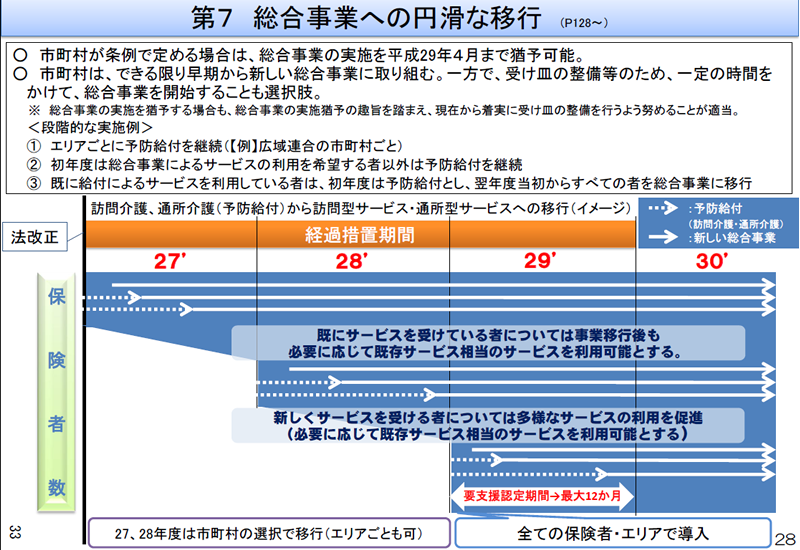 要支援の認定が最長12ヵ月間のため、最終的に平成30年の4月までに、すべてのサービスが新しい体系のもとに行われていることになります。